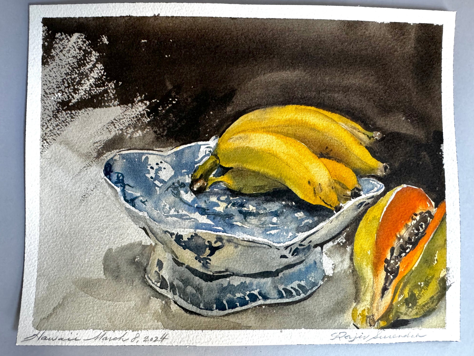 Still life: Bananas, cut papaya, in an antique Chinese porcelain dish. Painted in Hawaii on Arches paper, 2024