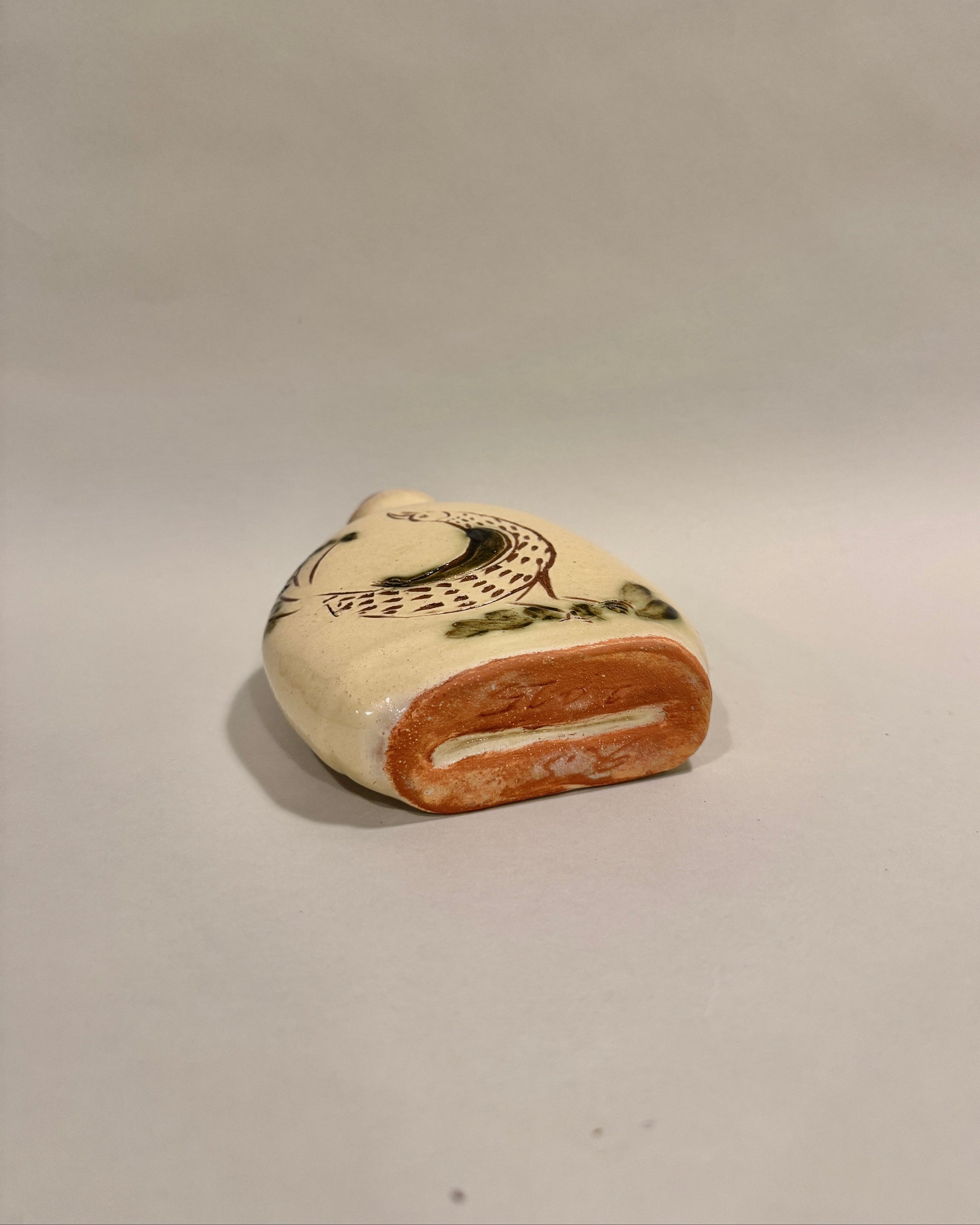 Guy showed me how to make these wonderful "Captain's Flasks" that have roots in both 19th century pottery and 18th Century "hip flasks". They were so much fun to make, we spent an afternoon playing in the pottery workroom throwing the bottle shape, flattening them out, dipping the red clay piece into white slip and then carving away the design. These flasks hold liquid but are low-fired so they may leave a watermark when placed on a surface.