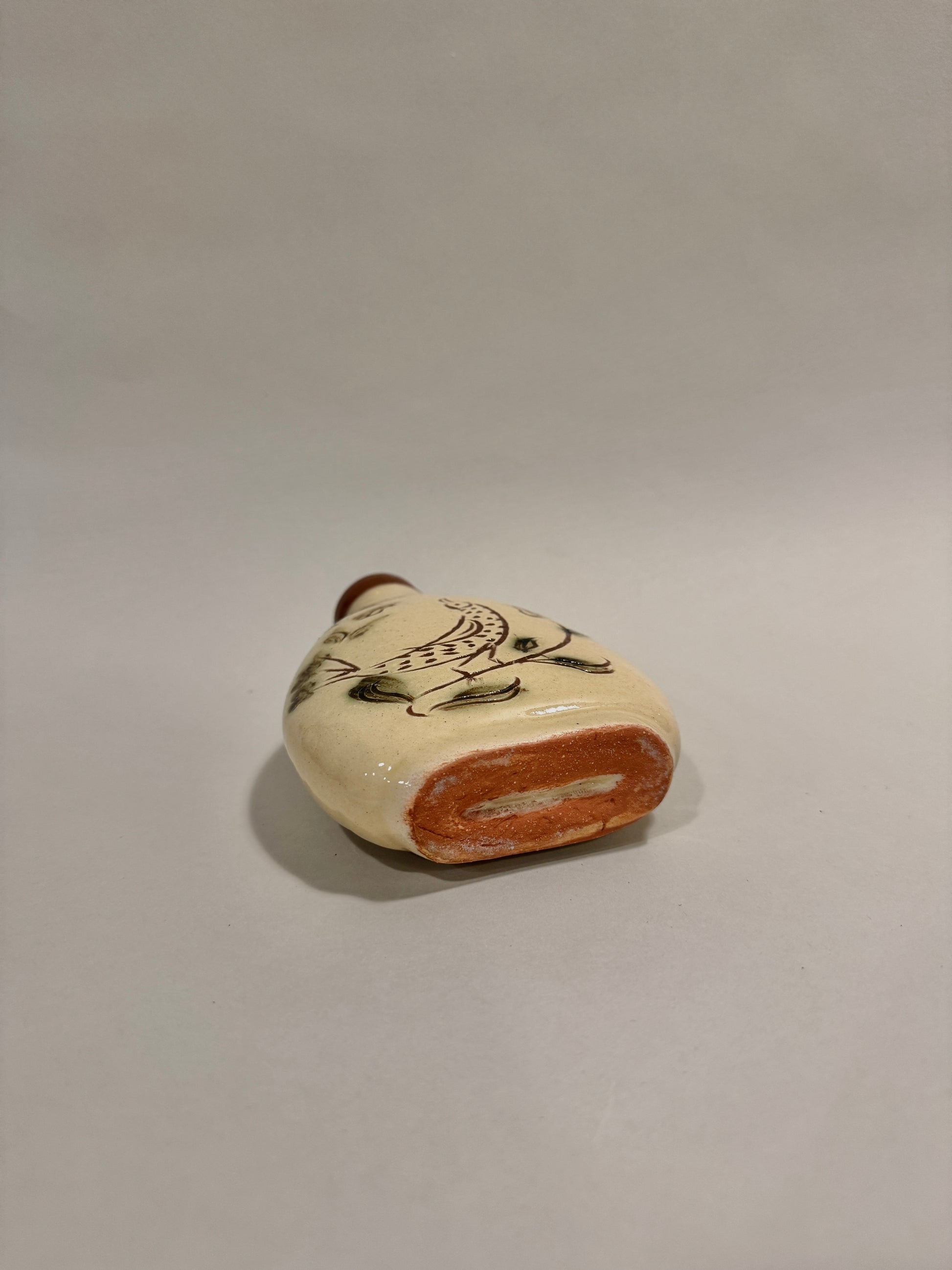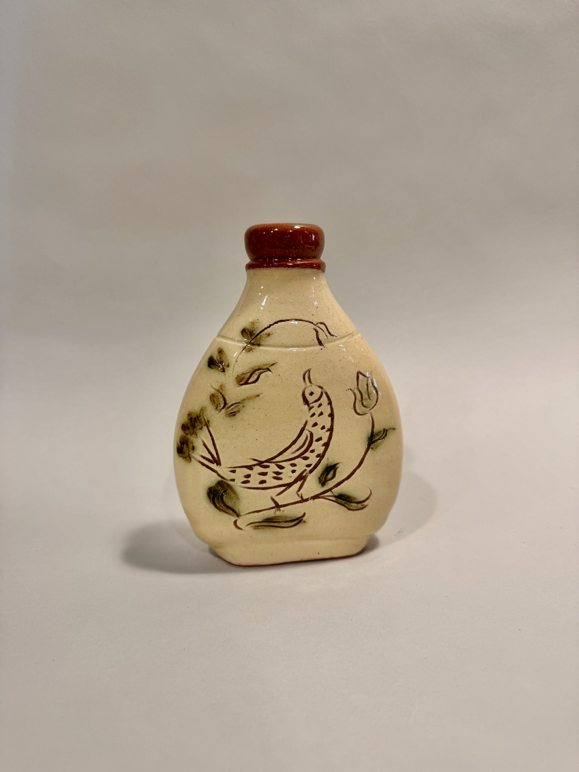 Guy showed me how to make these wonderful "Captain's Flasks" that have roots in both 19th century pottery and 18th Century "hip flasks". They were so much fun to make, we spent an afternoon playing in the pottery workroom throwing the bottle shape, flattening them out, dipping the red clay piece into white slip and then carving away the design. These flasks hold liquid but are low-fired so they may leave a watermark when placed on a surface.