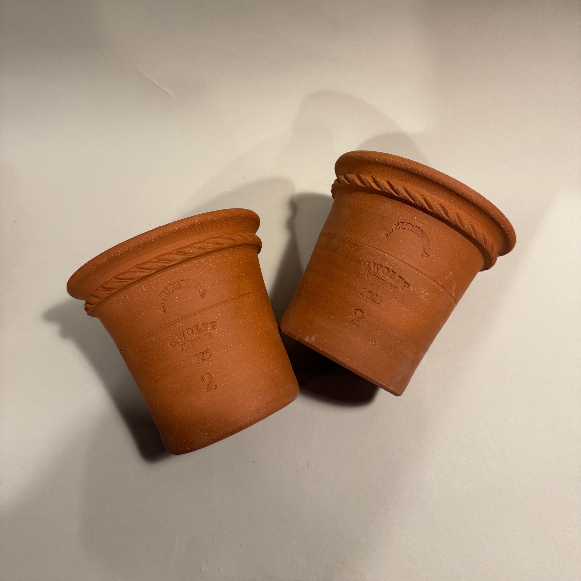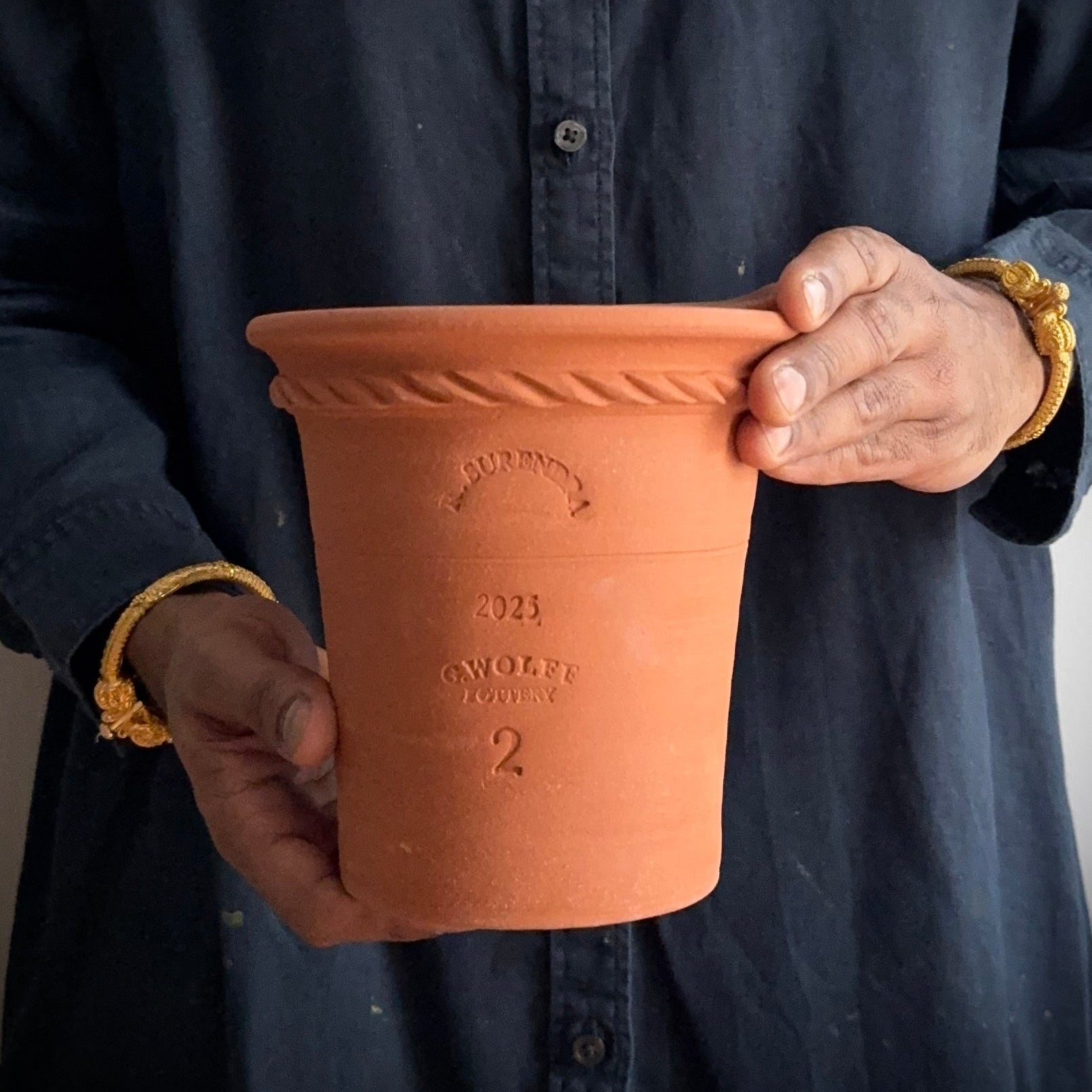 Stamped: Guy Wolff Pottery, R.Surendra, 2025 and 2 (representing the 2lbs of wet clay used to make this pot). Signed R.S. 2025 on bottom.