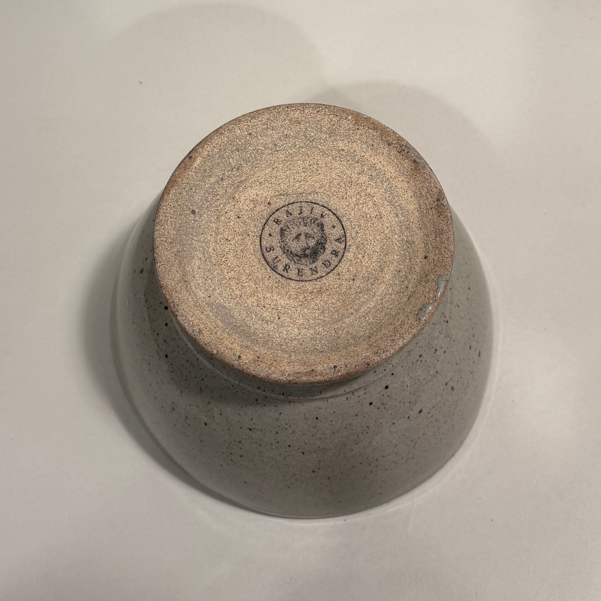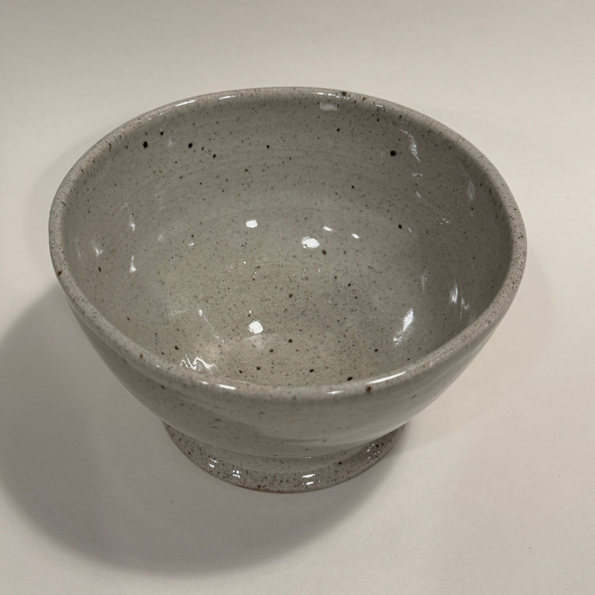 I made this stoneware bowl in Rhode Island, inspired by an antique ironstone bowl in my personal collection. I loved to proportions of the bowl, but also the detail of the foot that makes this shape more formal. The celadon glaze was applied by Guy Wolff before he fired it in his gas powered outdoor kiln in Connecticut (this bowl has travelled a lot in the manufacturing process)! The green/gray glaze is mottled from minerals in the clay body.