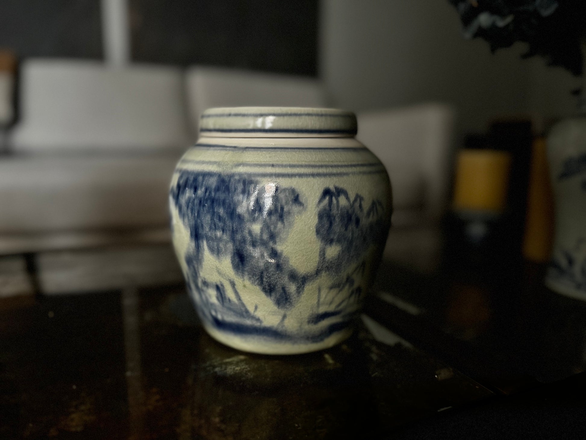 Rajiv produces these high-fired porcelain pieces once a year, in the fall, with Guy Wolff. These pieces were thrown by Rajiv on the wheel. The blue decoration on these vases were painted by Rajiv using cobalt, before being dipped into celadon glaze by Guy and then fired to cone 10 in a propane-fuelled kiln on the Wolff property.