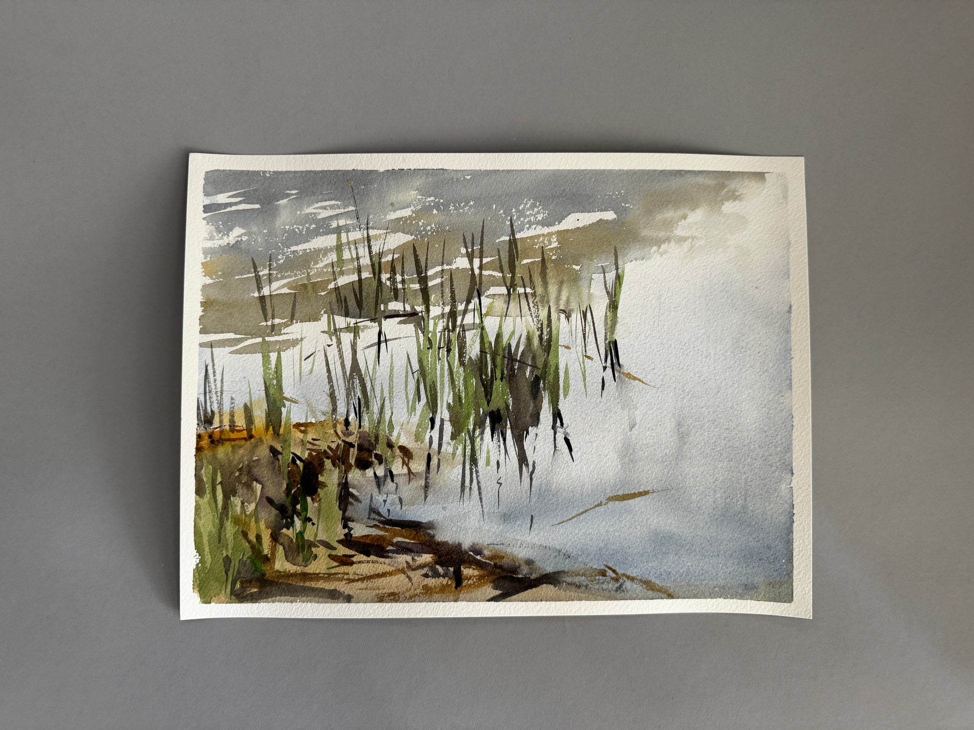 Study of pond grass and reflections, painted en plein-air in Rhode Island