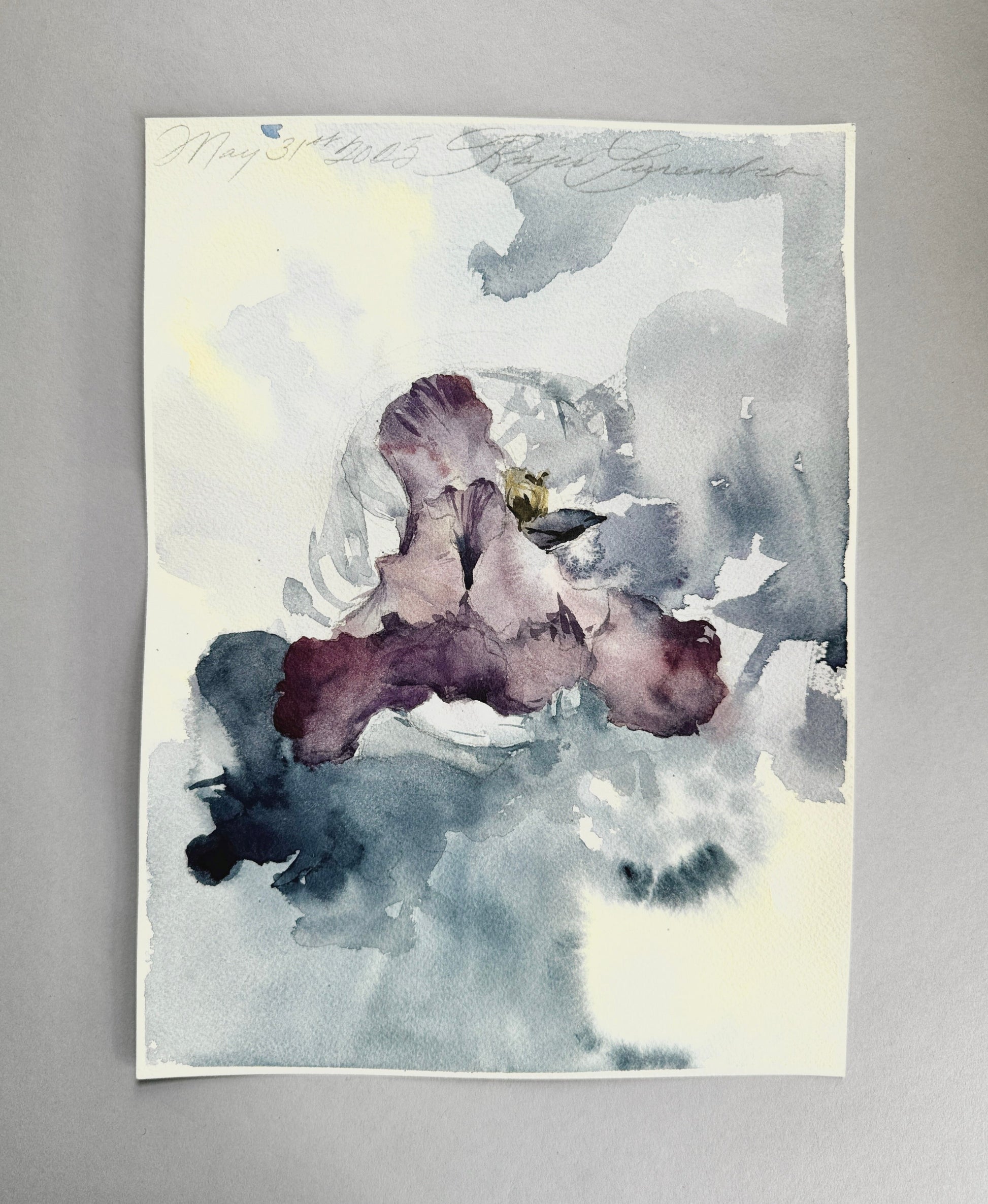 On a recent trip to Denver, I spent three days painting purple irises from their garden. This is the third study I did of a single Iris, in a glass of water. The glass was sitting on the ground and I painted this looking down at it under the shade of some trees, which created this dappled shadow. Studying the form of the iris revealed its beautiful triangular forms; the open three petals form a flat triangular plate with a triangular pyramid of closed petals sitting on top. I always look carefully at the geometric structure of a flower before drawing or painting it, which helps immensely with understanding how to draw it. The petals of a flower are never randomly arranged, they always follow a mathematical form - usually in threes or fives.