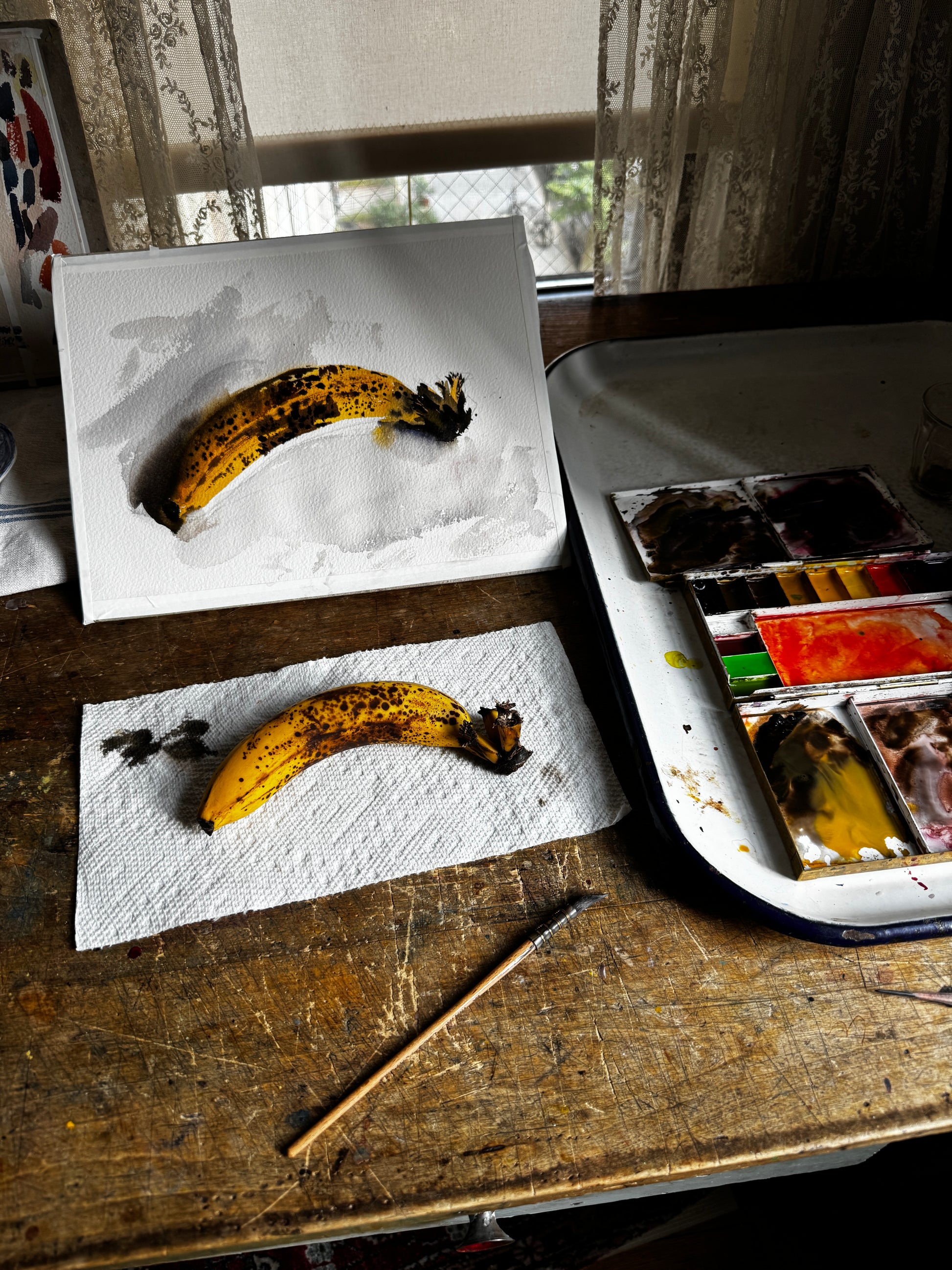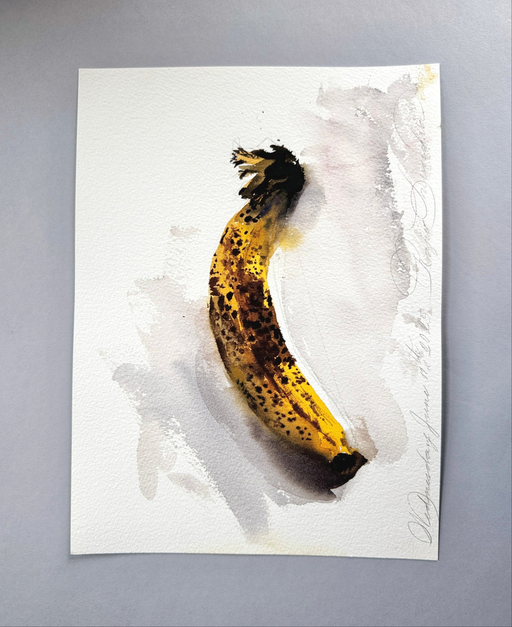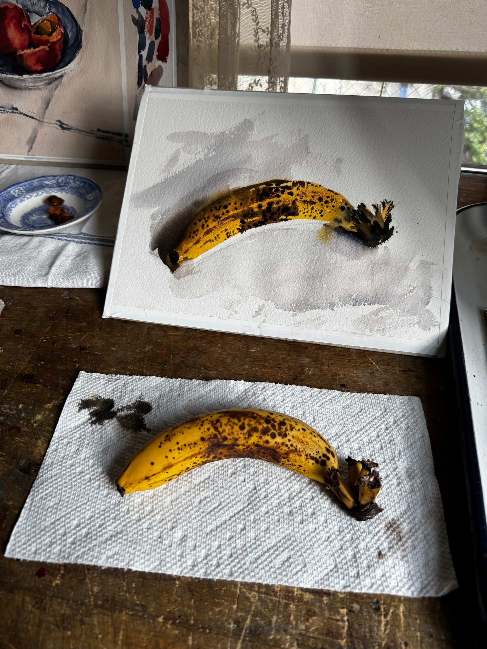 The goal of my watercolor practice is to one day have the skills and confidence to paint a subject accurately but compellingly "with the fewest strokes possible to express a fact" as John Singer Sargent once said, explaining his technique. I am learning, I am practicing and I'm looking and thinking so hard sometimes by brain hurts. Every now and then I have a magic moment where it all just works and comes together in a way that surprises even myself. And I know that it's not magic, but the sign that my efforts are paying off and that the years of work to develop this skill are starting to prove worthwhile. Painting this banana was one of those experiences and this single overripe banana is my best piece from this latest group of watercolor studies. I was able to apply what I'd tested and observed from attempting to paint bananas before (two of those studies are in this sale painted May 12th and 22nd), and I did this painting without overworking the paint. In watercolor, the beautiful aspect of this medium includes some of the details created when the wet paint moves out of control. One such area of this study is the yellow 'bleeding' that occurs near the top of the banana, where the yellow bloomed into the white surface because it was painted while the white area was still wet. Overall, this was painted loosely and confidently and I shocked myself when it was done.