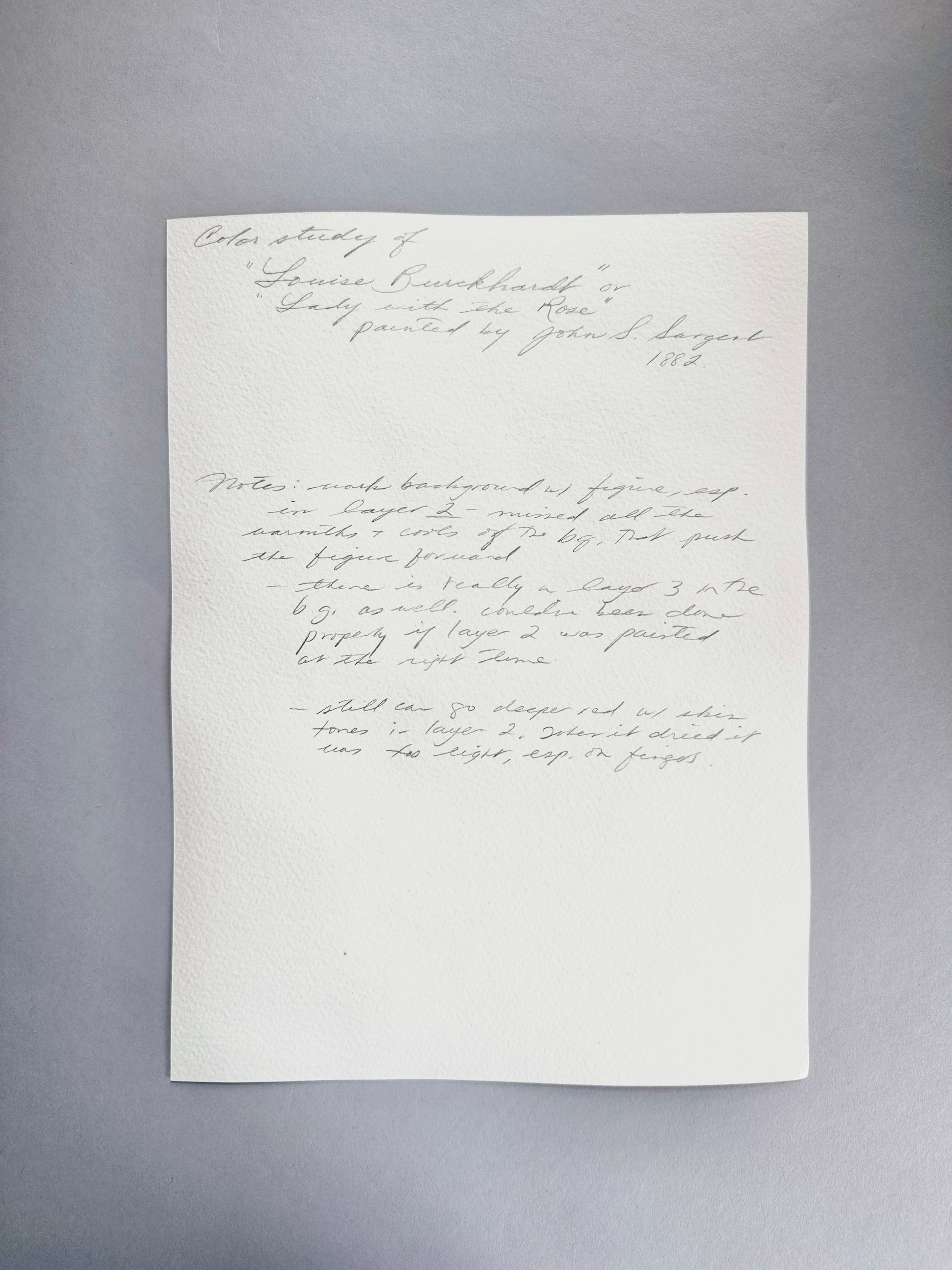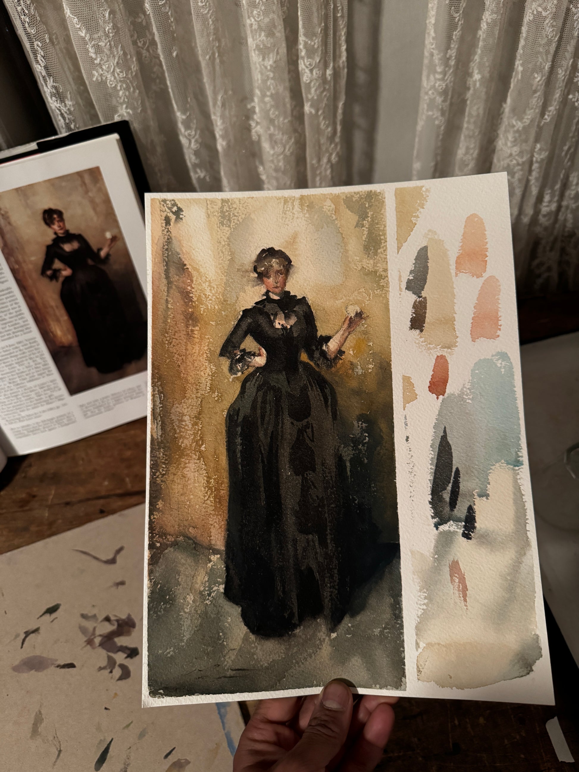 This was a color study of an oil painting by John Singer Sargent: Luise Burckhardt 1882. I've looked at this actual painting many times, as it hangs at the Metropolitan Museum of Art here in New York. My focus in this attempt was to capture the beautiful dance of color and tonal variation in the blacks of the dress, the cloth that hangs as the background and the deep shadow where there's no discerning line between it and the dress. In scrutinizing Sargent's method for painting the black silk dress, I learned that the lighter areas have blue/turquoise in them. When this sits directly beside the darkest areas of black, the illusion of silk satin is created. There were also tiny areas of the dress that are thin and gauze-like, so wonderful to paint in watercolor.