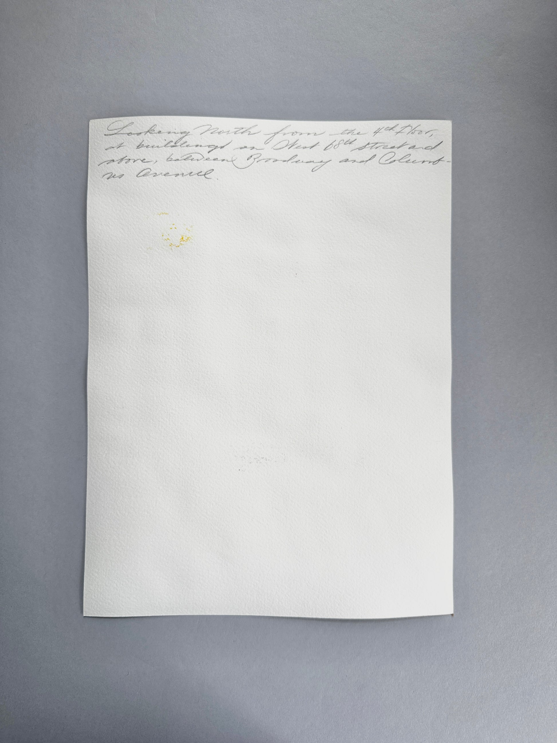 I painted this study at the gym, from the 4th floor looking through the window facing north, at buildings on West 68th Street and beyond. While working out, in between sets I'll often go to the window and look out. On street level, I'm usually looking UP at these buildings but it's fascinating to be looking down at rooftops from this perspective. These rooftops are peppered with the cooling and heating systems for the buildings, both old and new, and I love the juxtaposition of the brick chimneys beside steel fans and vents. I have been marveling at how my daily view from these windows change based on the weather and time of day. Compelled by the afternoon light and shadow cast on the rooftop of the building right across the street, I painted this study on a small piece of paper before returning again to paint it larger, with more detail. This is the second, and larger, study I did of this view. Painting from life forces me to look at so many things with a critical eye, and the most simple things reveal their beauty during this process; I loved the pairing of the warm red brick against beside the teal color of the glass windows in the two tall buildings beyond the flat rooftop.