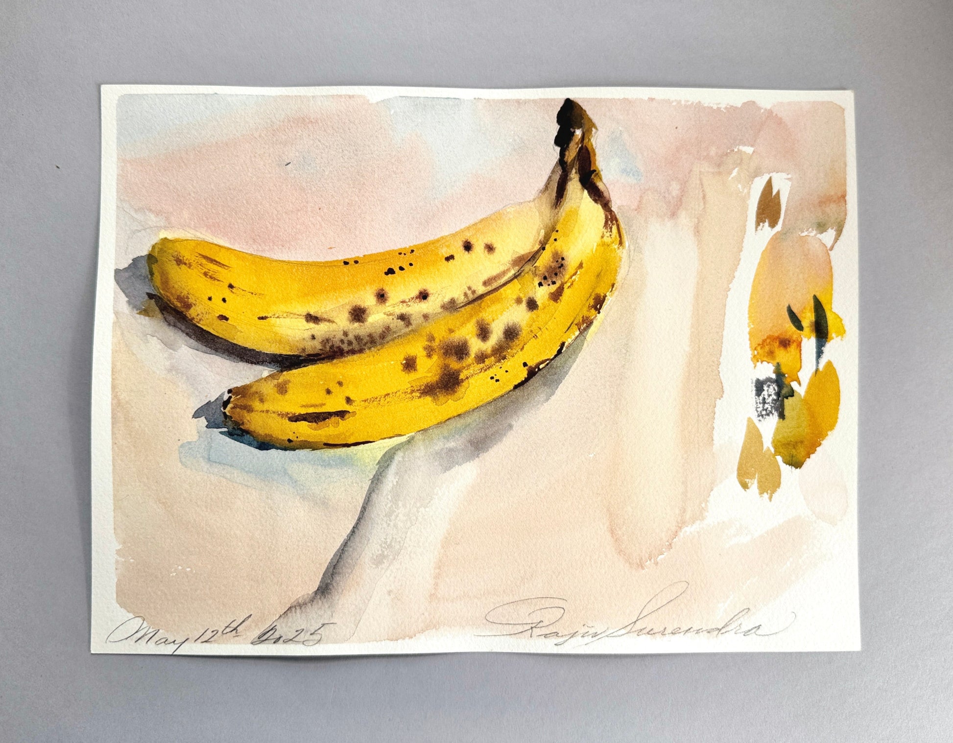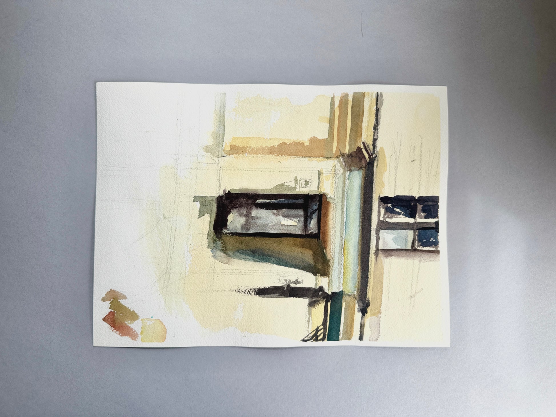 This was a very quick sketch I did of two ripening bananas. I have been painting this subject for a couple of months now, and usually do it slowly, attempting to capture minute details with the layering of watercolor washes. I've been noticing that as bananas ripen and the darker brown areas appear on the yellow skin, these circular 'dots' show up but with edges that are soft, bleeding gently into the yellow surrounding areas. For this study my focus was just those round spots and I wanted to experiment with painting them in a way that captured the feel of those soft edges, so I painted them 'wet-into-wet'. I quickly painted the yellow of the background and while this was still wet I added the brown dots. In areas where the yellow was very wet, the dots bled much more than the areas that were drying but still damp. This was a test to assess the level of bleed I wanted for those dots, which I them used for other paintings I did of bananas ripening. Everything beyond the brown dots in this study was loose because I moved on after figuring out what I wanted from the dots. The reverse of this study is an abandoned attempt at the facade of a building in the West Village.